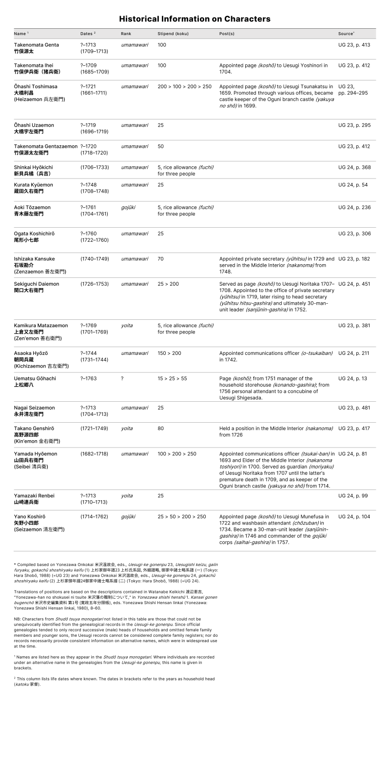 The majority of the characters that appear in Genta's tale were real-life retainers of the Yonezawa domain. The table below summarizes information about them as recorded in official domain genealogies and provides us with a glimpse of the social milieu of mid-ranking samurai that forms the backdrop to Shudō tsuya monogatari.