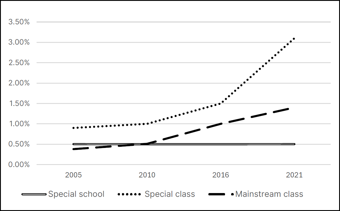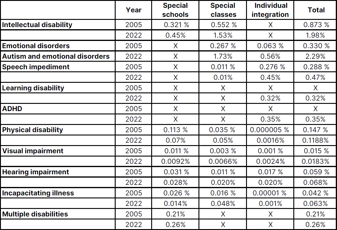 Table 1: Evolution of the number of disabled students by type of school/class as a proportion of the total school population. Based on MEXT data.