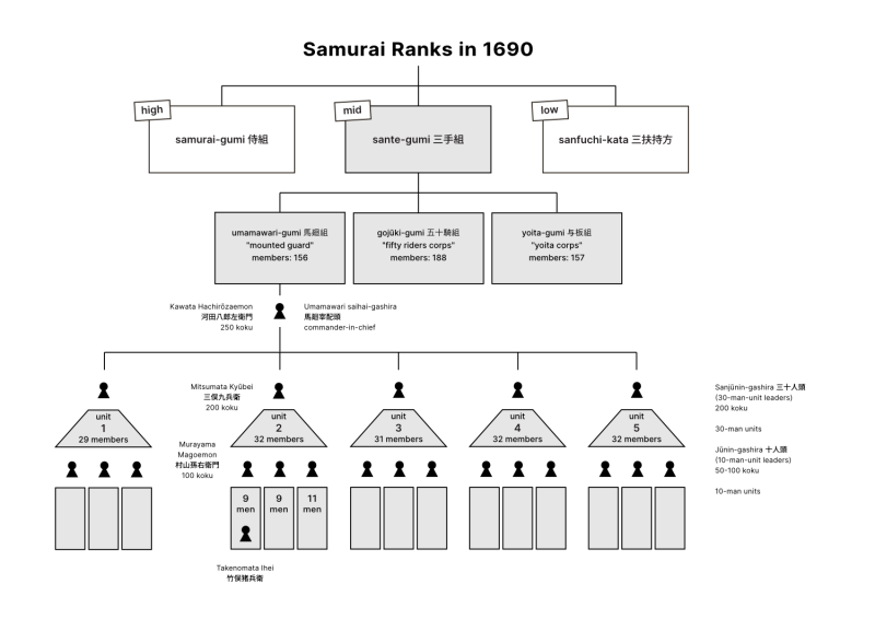 Samurai society in the Yonezawa domain was highly stratified, with incomes and opportunities for administrative positions varying widely according to rank. The tables below provide an overview of the Yonezawa domain structure and summarise the Yonezawa samurai ranks as they appear in the 1690 roster of retainers. This roster includes Genta's father, Takenomata Ihei, and shows the place of Genta's family within samurai hierarchies.